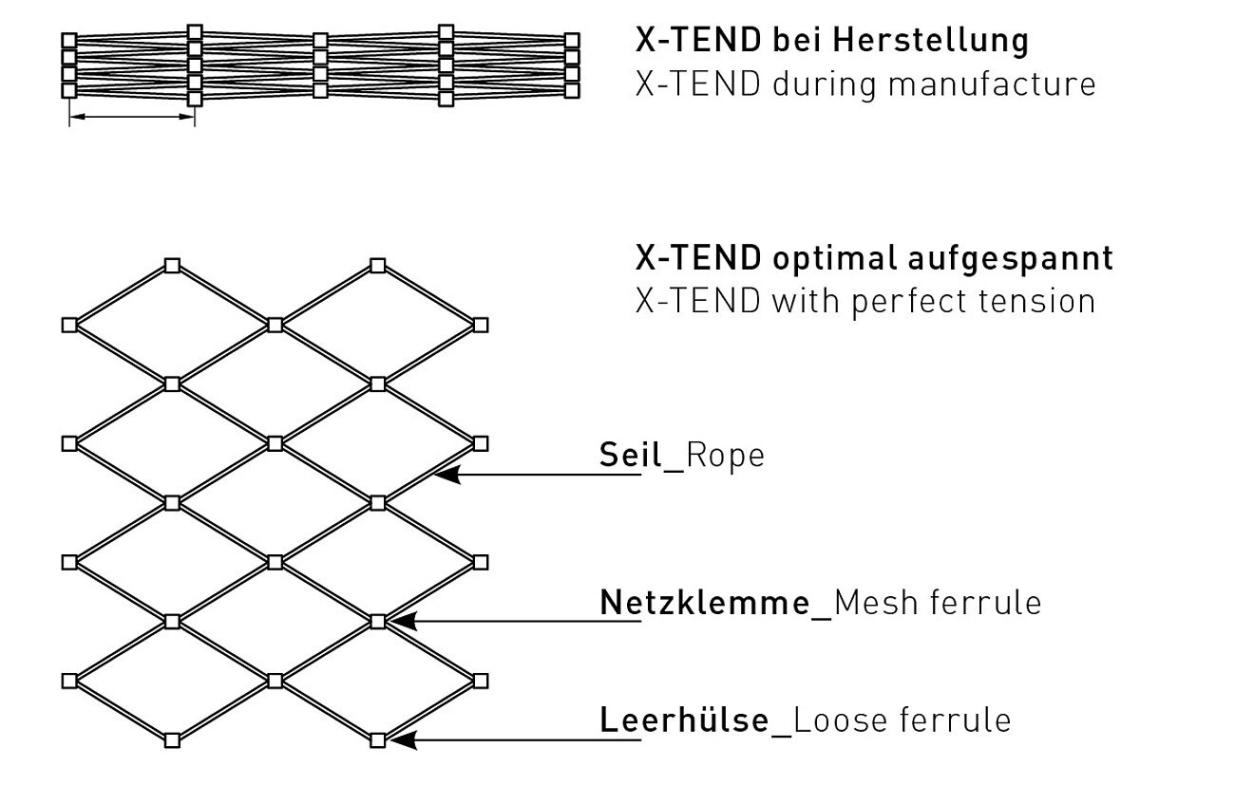 X-TEND is fabricated from high-quality and robust stainless steel cables (material: AISI316). These are linked together by a special method using stainless steel ferrules to form a stressable yet flexible structure for two- or three-dimensional applications. X-TEND keeps its shape indefinitely and requires little maintenance only during its long lifetime.
